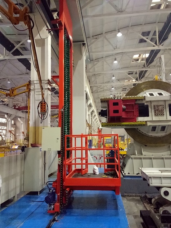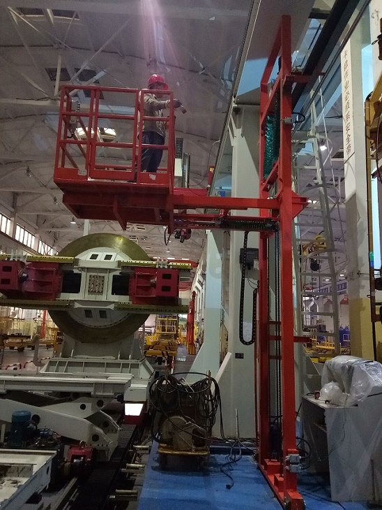 三維升降平臺采用蝸輪蝸桿減速機減速后,通過傳動軸及鏈輪鏈條的機械傳動方式,將旋轉運動轉化為垂直升降運動,驅動裝置設在小車頂部,使用兩條循環(huán)鏈,在驅動鏈輪作用下使平臺上、下往復運動,設有行程開關保護。二節(jié)為人工推拉式,行走裝置為雙輪驅動,保險裝置為鏈條、鋼絲繩雙重保險。
